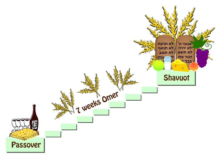 היָמים שֶבֵּין פֶּסח לשָבוּעוֹת הם ימֵי סְפִירַת הָעוֹמֶר. בּכָל עֶרב סוֹפרִים יום נוֹסָף, וגַם את השָבוּעוֹת, למָשל: "היוֹם חמִישָה עָשָׂר יוֹם, שֶהֵם שנֵי שָבוּעוֹת ויוֹם אחד לָעוֹמֶר".